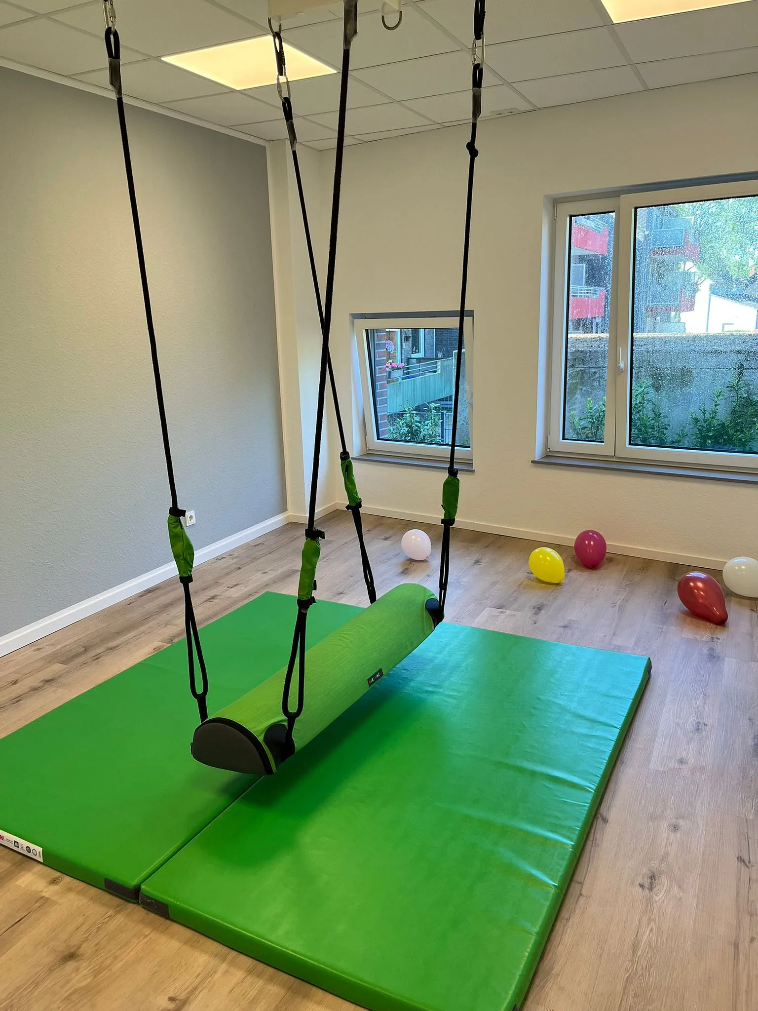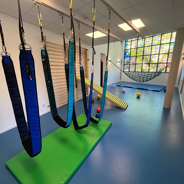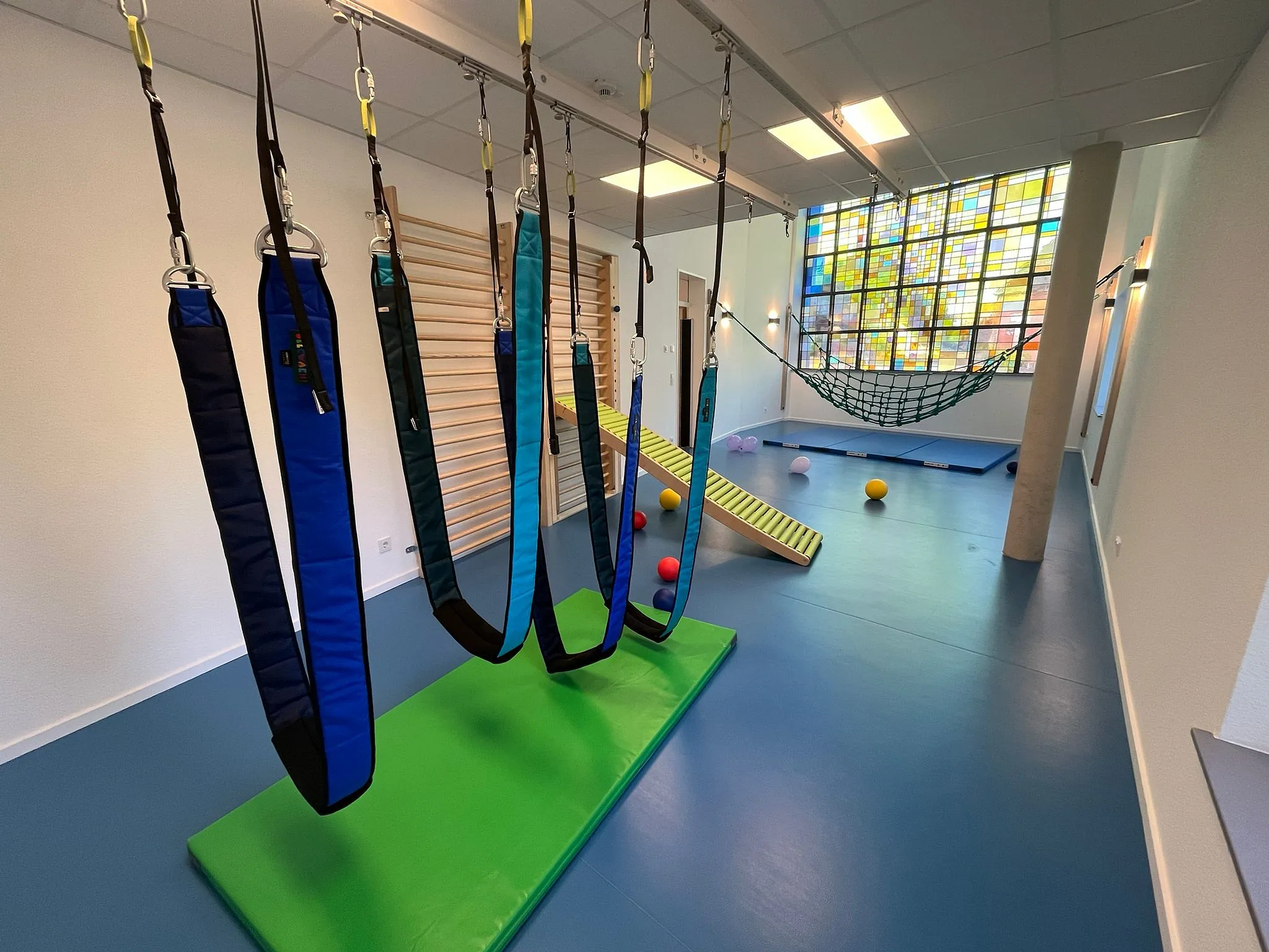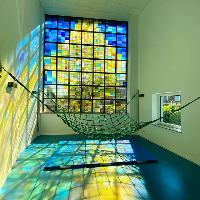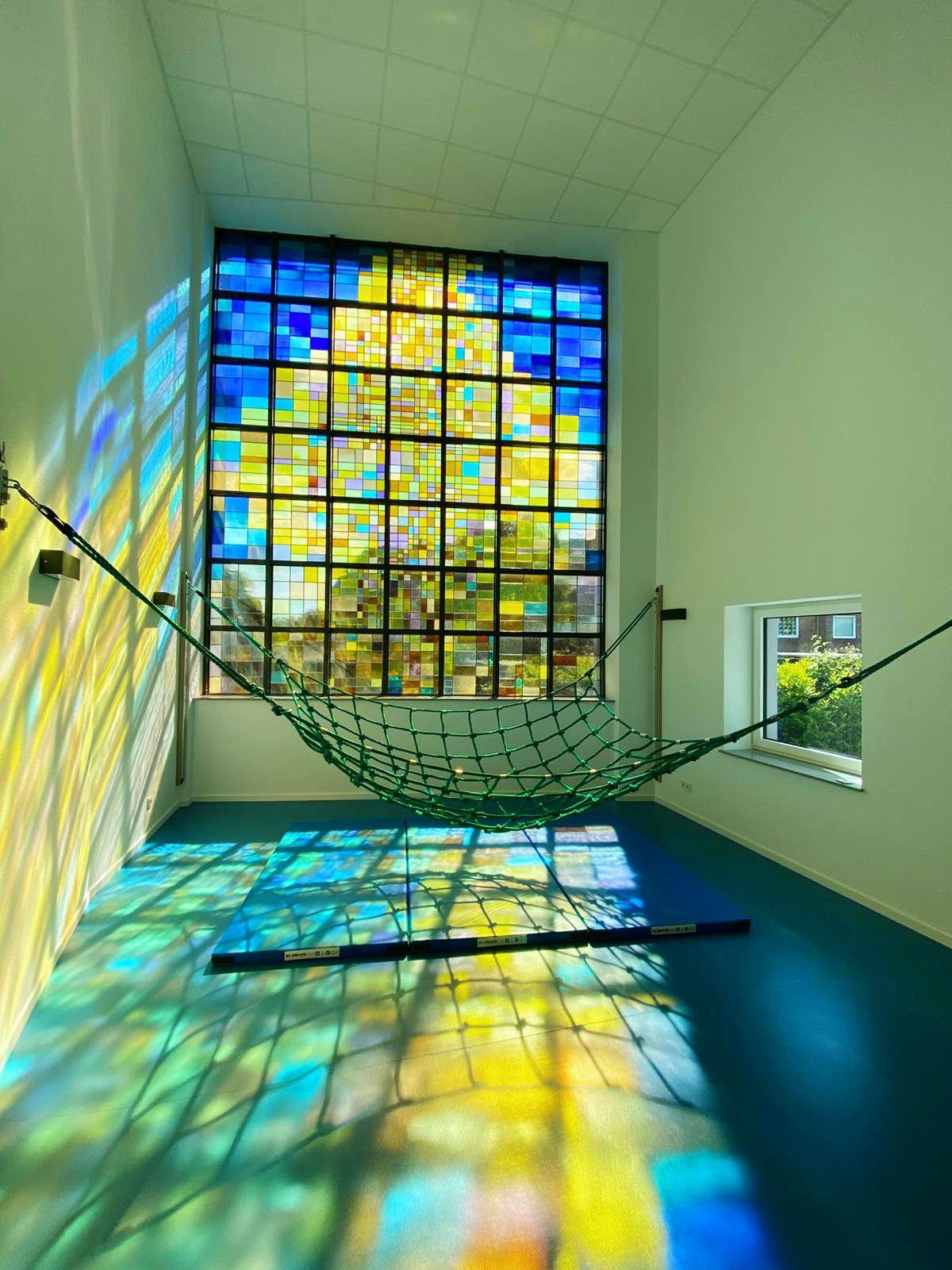 Besonderes Highlight unserer KiTa ist, dass das ehemalige riesige bunte Kirchenfenster in der Turnhalle erhalten bleiben konnte und somit bei Sonnenschein ein besonderes Lichtspiel in den Ruam zaubert.