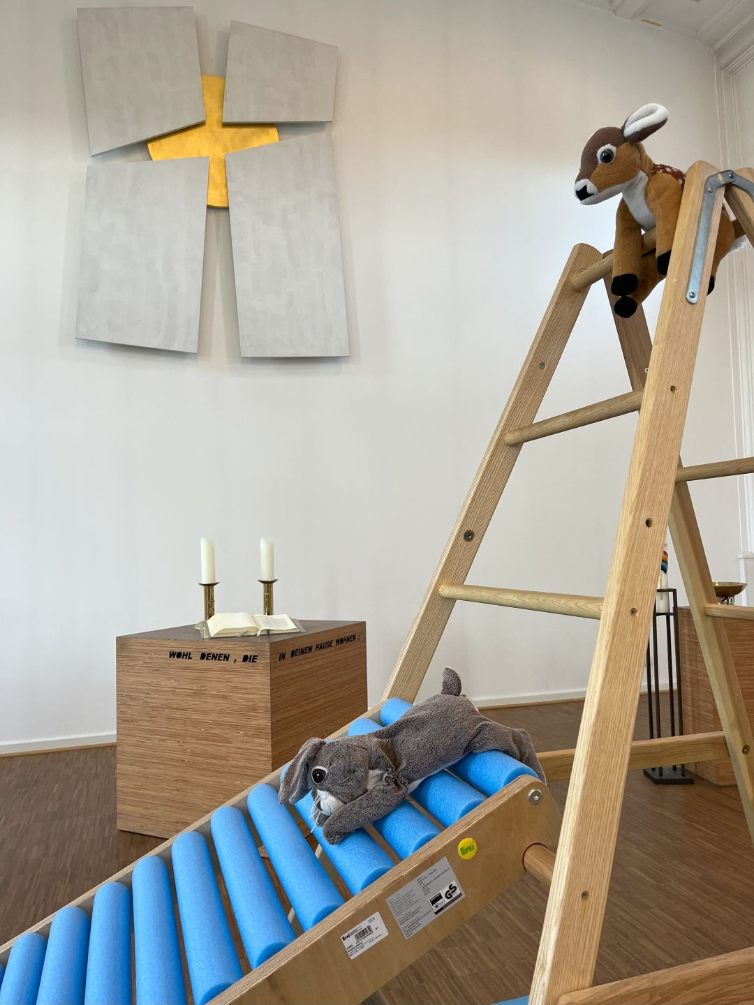 Ein besonderer Ort ist unsere Kirche in gleich doppelter Hinsicht. Zu unseren Gottesdiensten und Feiern können wir den Kirchsaal ganz individuell bestuhlen und herrichten. Zum Turnen nutzen wir den großen hellen Raum der Kirche unbestuhlt. Ein Nebenraum für Spiel- und Sportmaterialien geben viele Möglichkeiten, um motorische Angebote für die Kindern zu gestalten, große Bewegungslandschaften aufzubauen oder einfach zum Rennen und Toben. An zwei festen Tagen in der Woche gehen die Kinder turnen. Unabhängig von diesen Turntagen haben wir immer die Möglichkeit die Räumlichkeiten der Kirche zu nutzen.