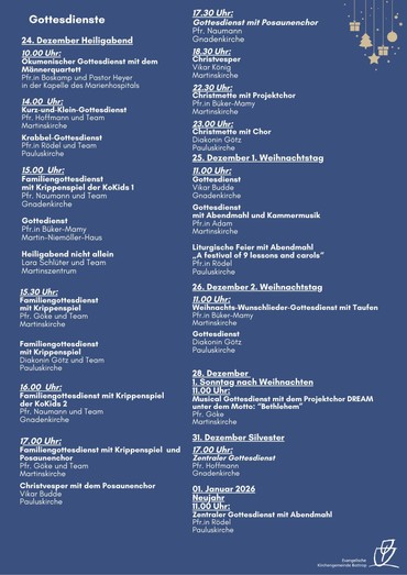 | 11.00 Uhr | Liturgische Feier mit Abendmahl "A festival of 9 lessons and carols", Pfr.in Rödel | |