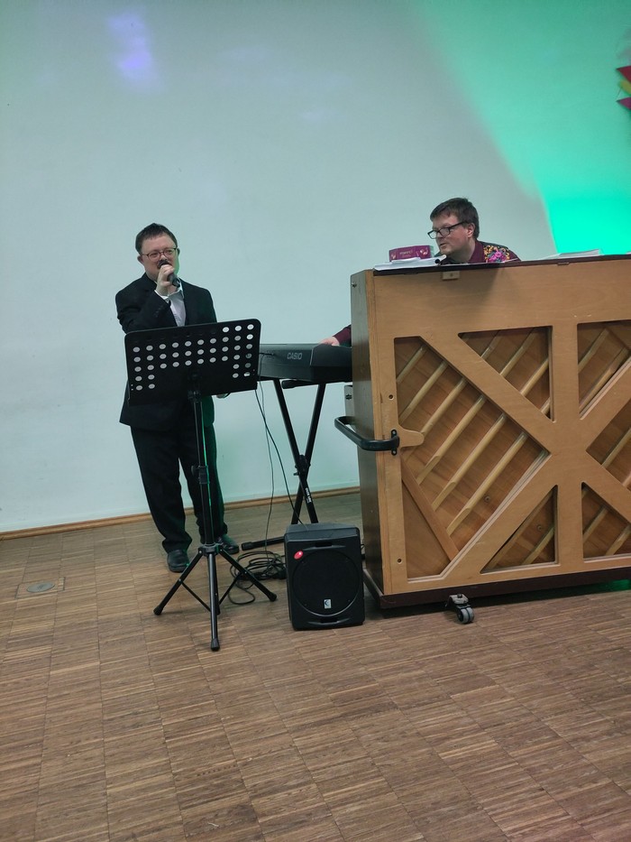 Beim "Uppi-Abend" im Martinszentrum stellten sich viele Aktive mit einem Lied vor. Im Bild Florian (am Mikro) mit "Dir gehört mein Herz", sensibel begleitet von Matthias am Klavier