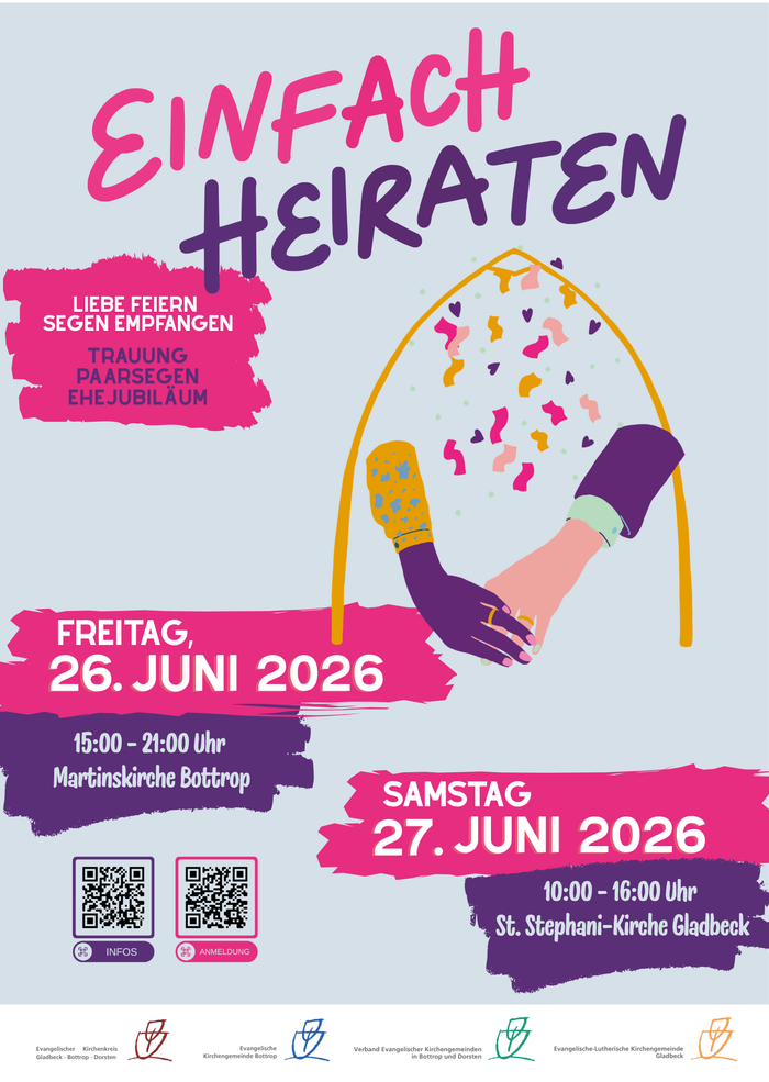 Am Freitag, 26. Juni 2026 und Samstag, 27. Juni 2027, öffnen die Gemeinden des Ev. Kirchenkreises Gladbeck-Bottrop-Dorsten die Türen der Martinskirche und St. Stephani für alle Paare, die ihre Liebe unter den Segen Gottes stellen möchten – einfach, persönlich und würdevoll. Ihr seid herzlich eingeladen zur Aktion „einfach heiraten“ der Evangelischen Kirche in Deutschland.