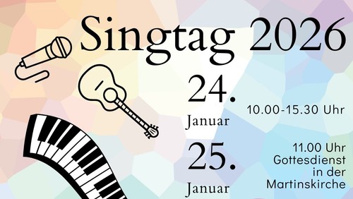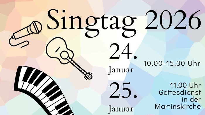 Am letzten Wochenende im Januar treffen sich alle Generationen in der Martinskirche. Die Jahreslosung 2026 "Siehe ich mache alles neu" steht thematisch im Mittelpunkt. Zunächst gibt es ein fröhliches Aufwärmen mit allen gemeinsam, es schließt sich ein Programm für altersentsprechende Gruppen an: ein Erwachsenenchor übt mehrstimmige Lieder mit Julia Schlegel, in der Band lernen Instrumentalisten und jugendliche Sänger moderne Stücke zur Jahreslosung kennen, in der Kindergruppe wird gemeinsam gesungen, gespielt und das Thema kreativ erschlossen. Beim gemeinsamen Mittagessen und Kaffeetrinken ist Zeit für Gespräche. Am Sonntag wird die Gottesdienstgemeinde einbezogen in das besondere musikalische Erlebnis und zum Nachdenken inspiriert über das Neue, von dem im Bibelvers die Rede ist.