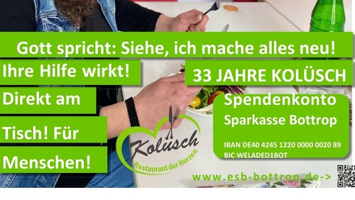 Kolüsch wäre nicht möglich ohne die vielen ehrenamtlichen Helferinnen und Helfer, das engagierte Team der ESB, unsere Partner, Spender und Unterstützer aus Kirchengemeinden, Unternehmen, Institutionen und privaten Haushalten. Jede Spende zählt. Jeder Einsatz berührt. Ihre Unterstützung ist ein Zeichen gelebter Mitmenschlichkeit – und macht deutlich, wie viel Kraft in Gemeinschaft steckt. Gemeinsam mit Ihnen kann Neues entstehen – mit Herz, mit Hand, mit Gott.