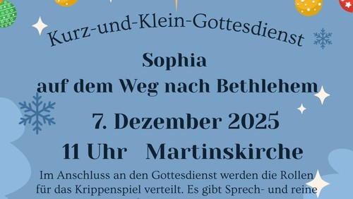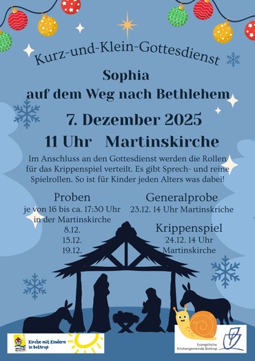 Im Anschluss an den Gottesdienst findet die Vergabe der Rollen für das Krippenspiel statt. Es gibt Text- und reine Spielrollen. Alle Kinder sind herzlich eingeladen mitzumachen!