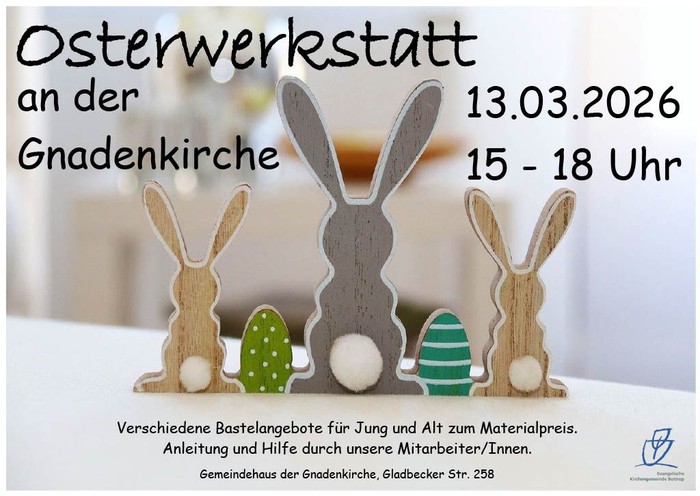 Die erste wird an der Gnadenkirche sein. Am Freitag, den 13. März 2026 von 15.00 - 18.00 Uhr. Ihr braucht euch nicht vorab anmelden und könnt einfach vorbei kommen. Es gibt verschiedene Bastelangebote für Jung und Alt zum Materialpreis. Anleitung und Hilfestellung geben unsere Mitarbeiter:innen.