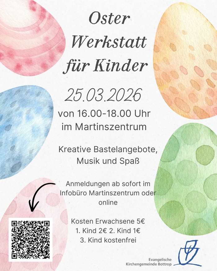 Die zweite Osterwerkstatt findet im Martinszentrum, am Mittwoch, den 25. März 2026 von 16.00 - 18.00 Uhr statt. Es gibt ebenfalls kreative Bastelangebote, Musik und ganz viel Spaß! Hier ist eine Anmeldung nötig. Gerne Online mit dem QR-Code oder direkt im Infobüro des Martinszentrums. Die Kosten betragen 5€ für Erwachsene, 2€ für das 1. Kind, 1€ für das zweite Kind und das 3. Kind ist kostenfrei.