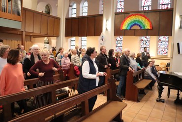 Rund 90 Sängerinnen und Sänger kamen kürzlich in der Bottroper Martinskirche zusammen, um internationale Kirchenmusik zu singen. Unter dem Motto „Singing in the Light of God“ hatten der Kirchenkreis, das landeskirchliche oikos-Institut für Mission und Ökumene und die Vereinte Evangelische Mission (VEM) eingeladen, internationale Kirchenhits in verschiedenen Sprachen zu singen. Begleitet wurden sie dabei von professionellen Musikerinnen und Musikern: Kreiskantor Matthias Uphoff, Chorleiterin Julia Schlegel, Sängerin und Querbeet-Moderatorin Anja Hoppe, Jörg Spitzer von der VEM und Espérance Mirindi von der Creative Kirche in Witten brachten den Sängerinnen und Sängern die Lieder bei, für die Begleitung sorgte eine Band: Tuve von Bremen am Schlagzeug, Hauke Schlüter an der Gitarre und Samuel Neubert von der Ev. Pop-Akademie in Witten am Bass.